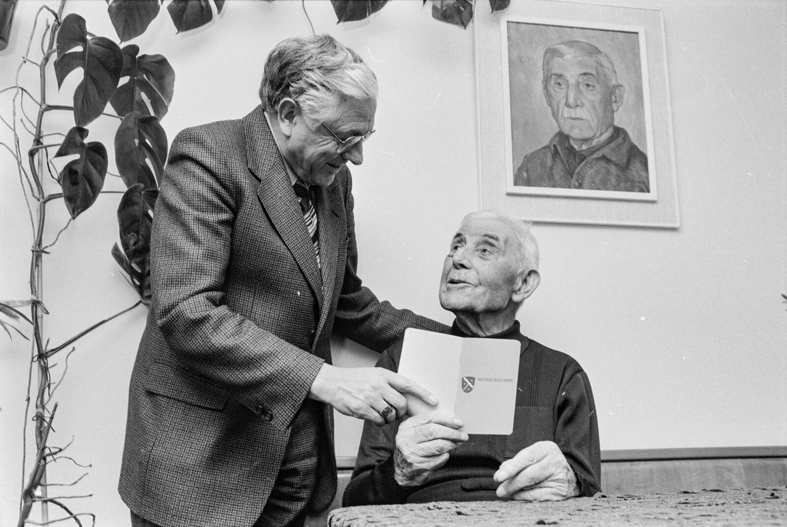 Hatten Quartiervereine früher mehr Geltung? 1980 überreicht der damalige Seebacher Quartiervereinspräsident Fritz Senn dem ältesten Seebacher einen speziellen Seebacher Pass. Bild: ETH-Bibliothek Zürich, Bildarchiv / Com_L29-0005-0022-0004