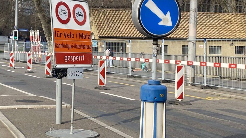 Der Grund für den temporären Velostreifen liegt in der Komplettsperrung des Bahnhofquais für Velos während des Neubaus der Tramhaltestelle Bahnhofquai/Hauptbahnhof. Bild: Lorenz SteinmannDie Wogen gingen hoch, als bekannt wurde, dass die Stadt Zürich am Neumühlequai in der Nähe des Hauptbahnhofs eine Autospur zum temporären Veloweg umfunktioniert hat. Die Betonung liegt auf temporär – und der Aufschrei der Autolobby ist übertrieben.